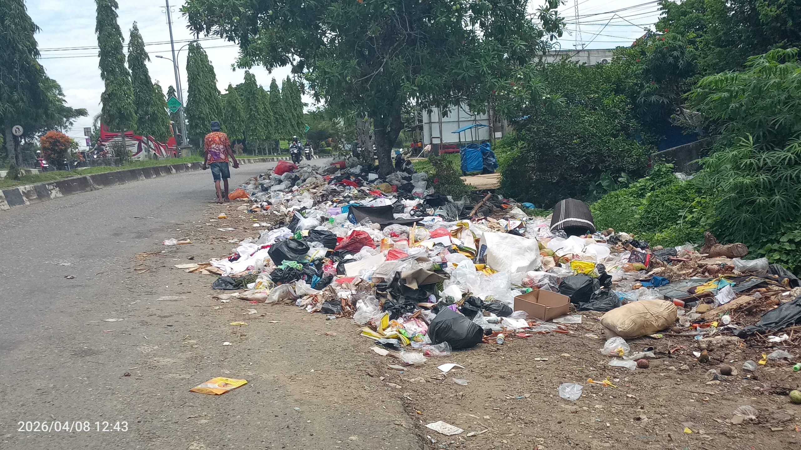 Pantauan pada Rabu, 8 April 2026, hingga sekitar pukul 13.00 menunjukkan sampah masih berserakan di seberang jalan toko Rocky collection di pinggir jalan.