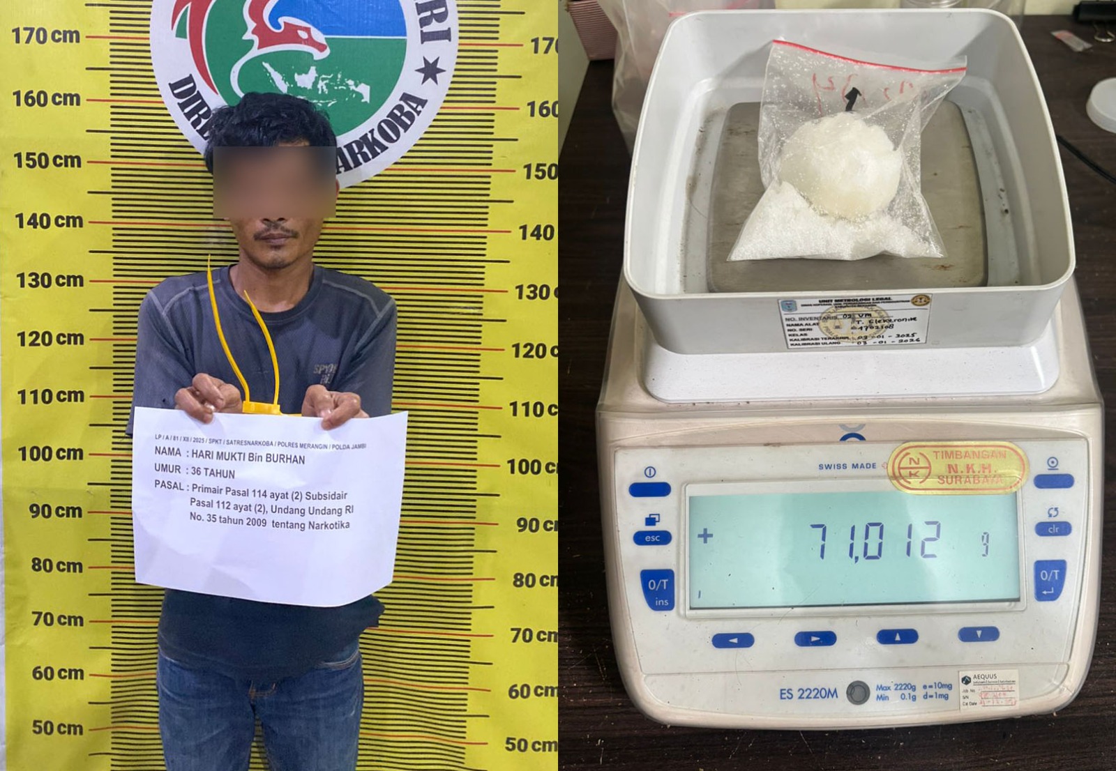 “Petugas kemudian mengamankan pelaku dan melakukan penggeledahan. Dari hasil penggeledahan ditemukan satu paket narkotika jenis sabu dengan berat bruto 71,012 gram,” kata Kasi Humas Polres Merangin, Iptu Sakirman, Jumat (19/12/25)